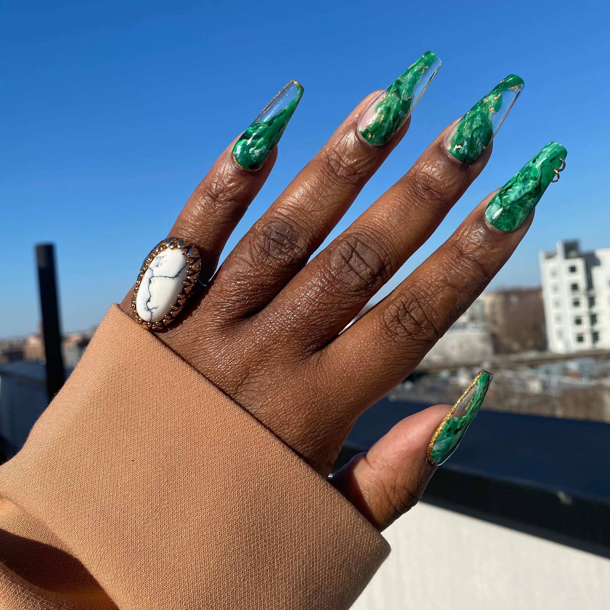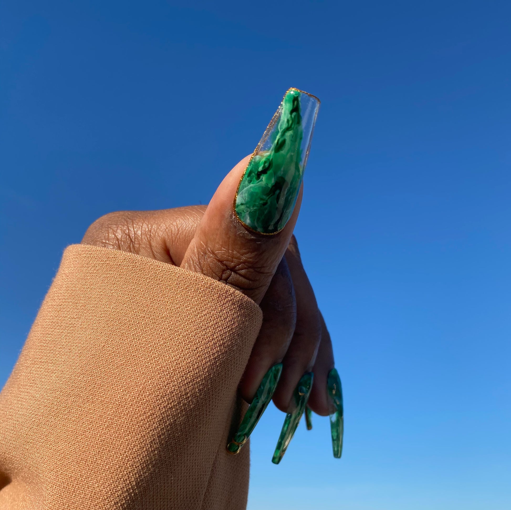 the VANITY set features marble medley with gold chrome accents and gold embellishments, available in 9 different lengths/shapes!